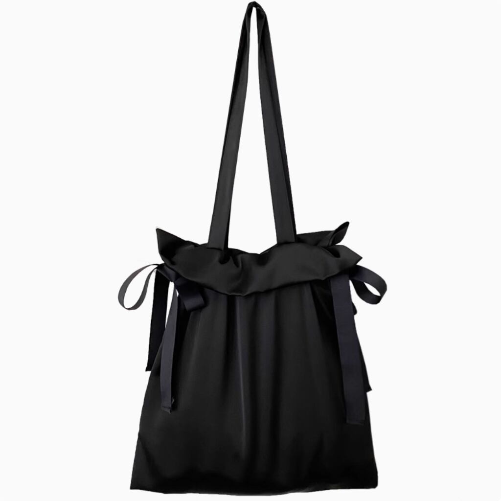 リボンディテールが魅力のトートバッグ。シンプルなブラックカラーでどんなコーディネートにも合わせやすく、実用性とデザイン性を兼ね備えたアイテムです。